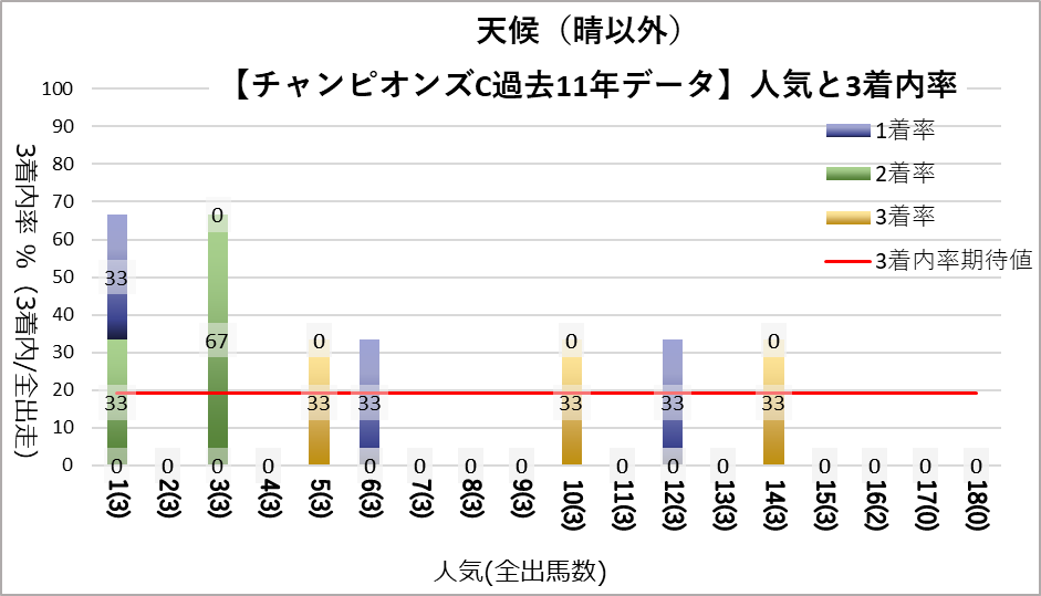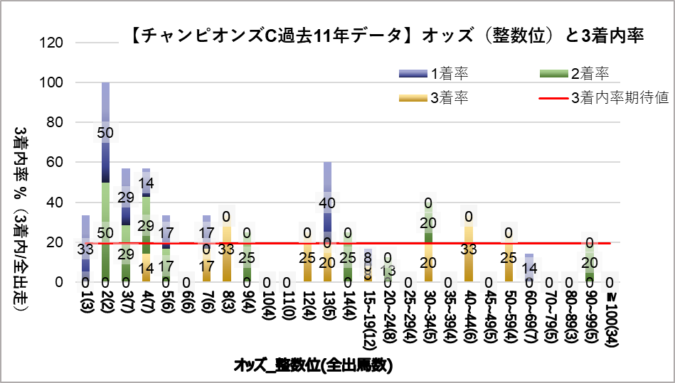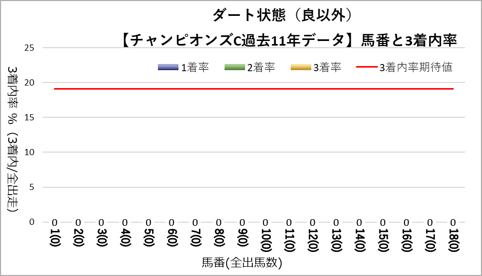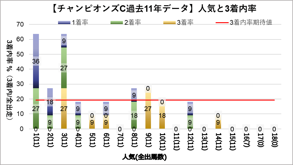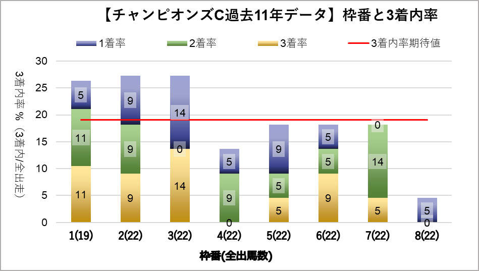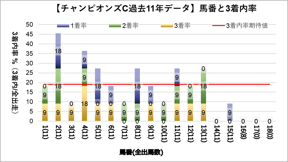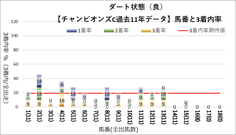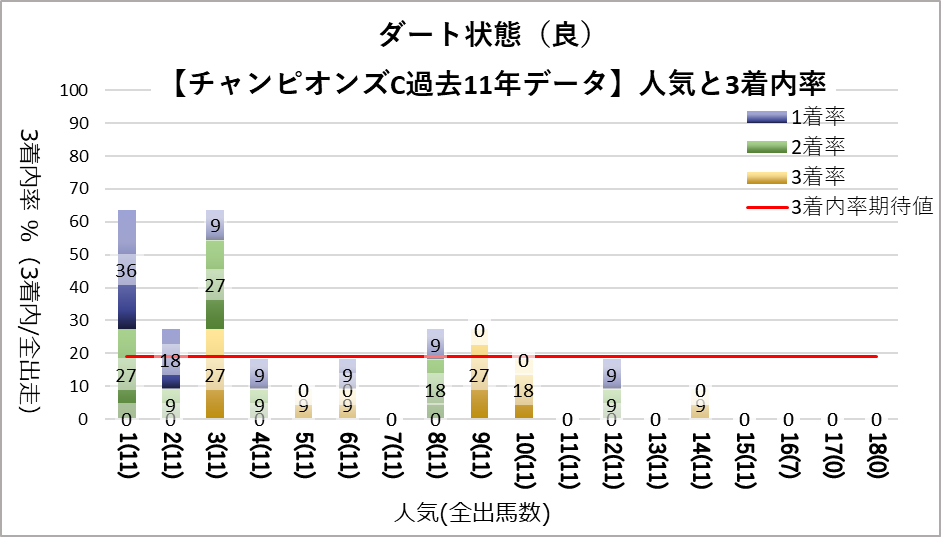 チャンピオンズカップへ変更となり、開催地が中京になった過去11レース分のデータを下記の評価項目と3着内率の関連についてグラフ化しました。