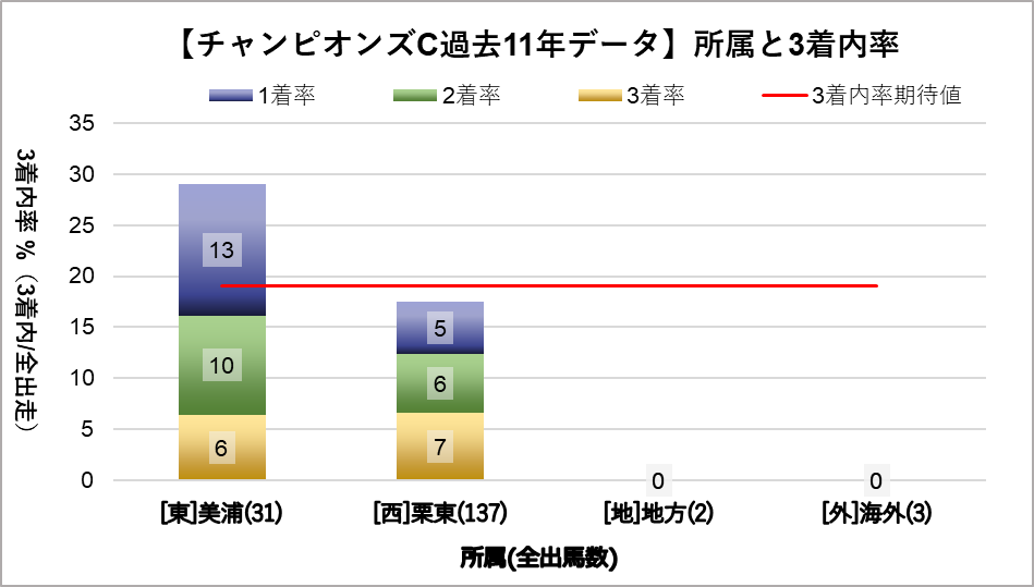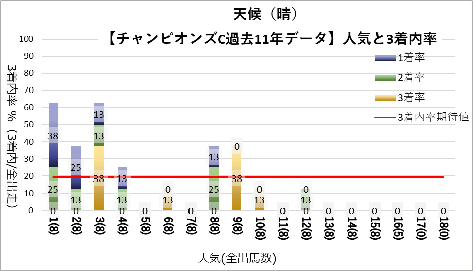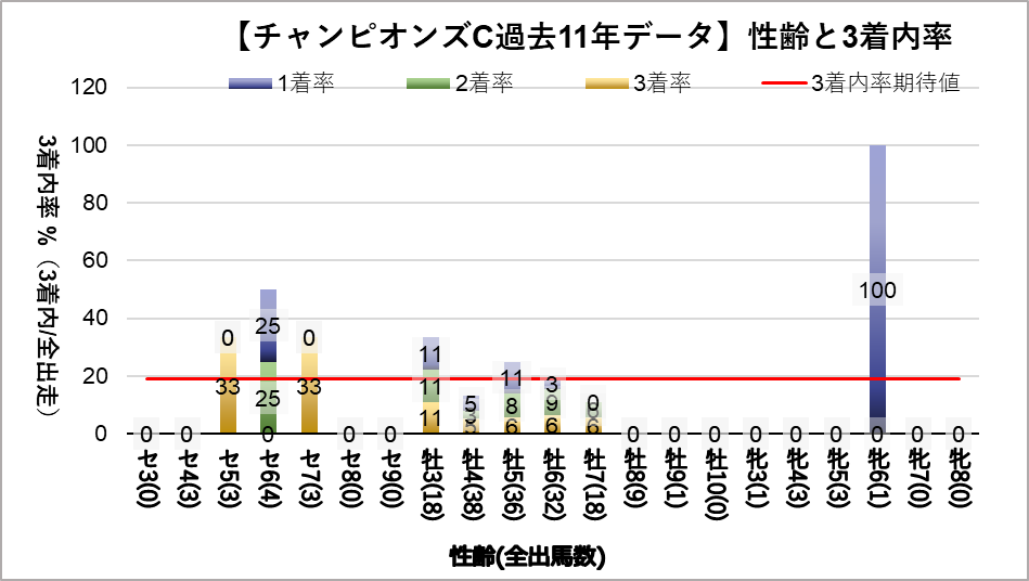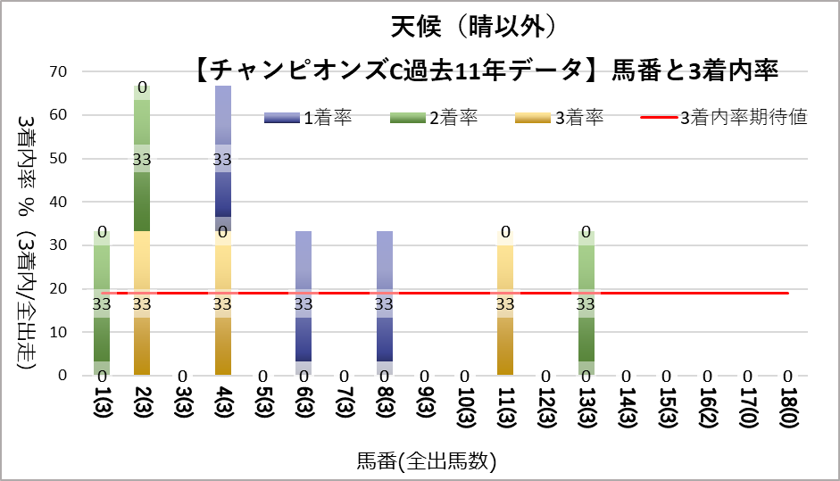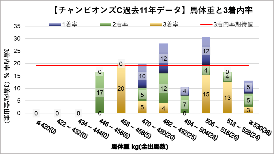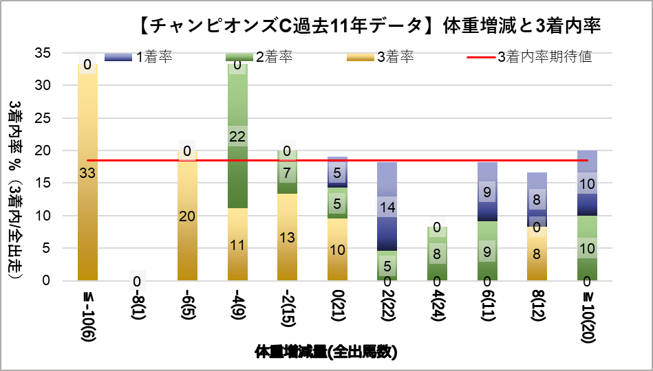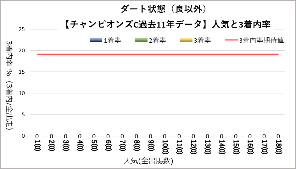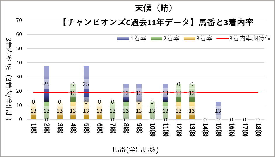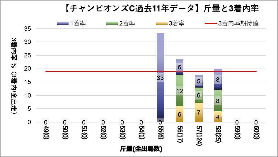 チャンピオンズカップへ変更となり、開催地が中京になった過去11レース分のデータを下記の評価項目と3着内率の関連についてグラフ化しました。
