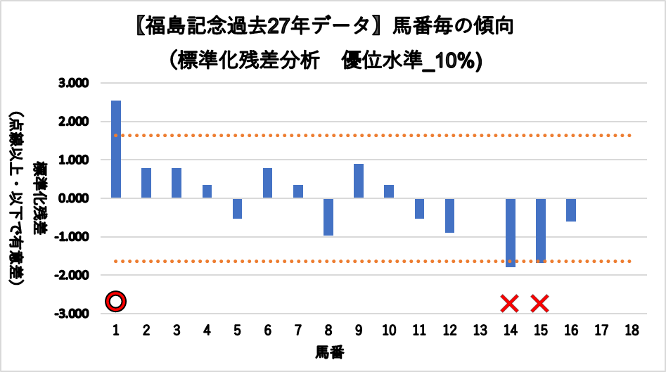 1番(複勝率40.7%)に統計的有意差が認められ、平均複勝率(19%)よりも好走する傾向が見られた。