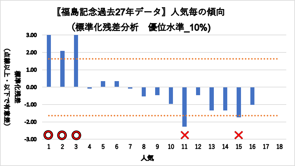 一方、11, 15人気においては有意に凡走する傾向が見られた。