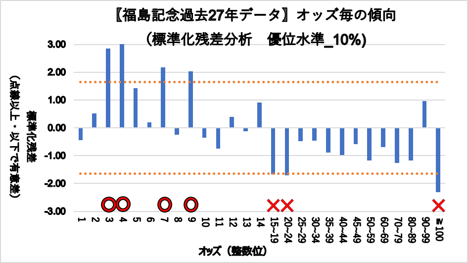 3.0~3.9倍(複勝率60.0%)、4.0~4.9倍(複勝率76.5%)、7.0~7.9倍(複勝率42.1%)、9.0~9.9倍(複勝率40.0%)、これらのオッズ帯に統計的有意差が認められ、平均複勝率(19%)よりも好走する傾向が見られた。
