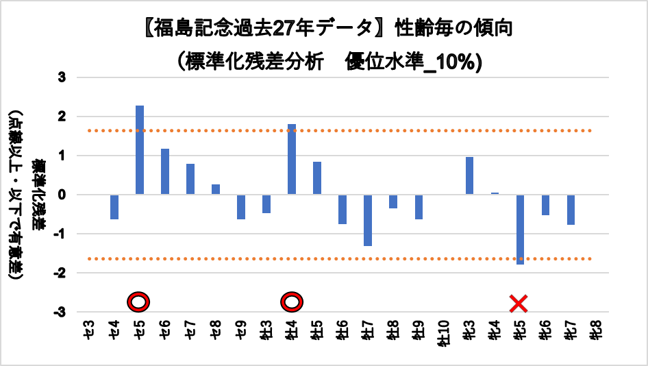 統計的に有意差があった項目について、3着内率グラフと統計処理(標準残差分析)グラフの2つを掲載しています。