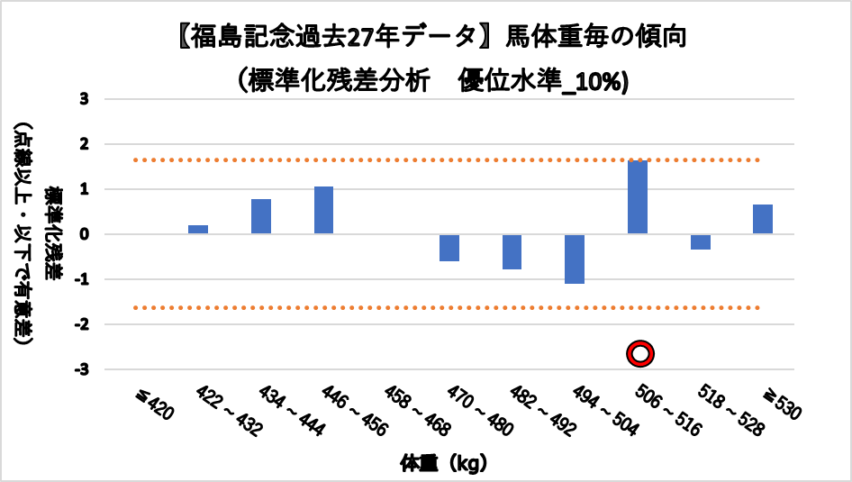 馬体重506~516kgレンジ(複勝率31.4%)において、統計的有意差が認められ、平均複勝率(19%)よりも好走する傾向が見られた