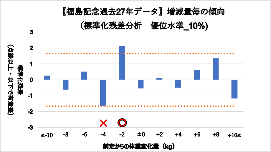 増減量-4kgについて有意に平均複勝率(19%)よりも凡走する傾向が見られた。