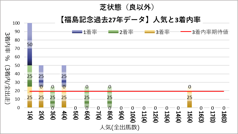 一方、芝状態が良以外の場合、1人気の複勝率が100%であり、2,4人気についても50%の好成績を残している。