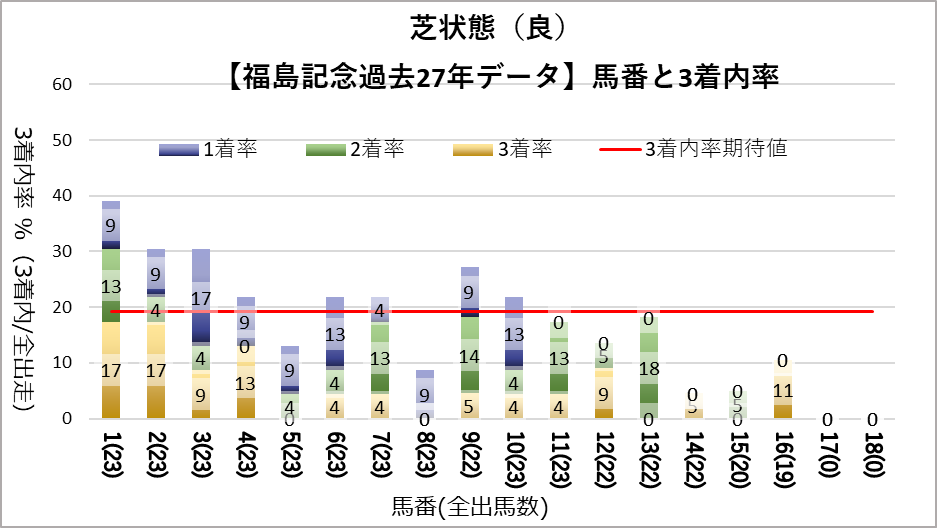 1枠(複勝率32.0%)に統計的有意差が認められ、平均複勝率(19%)よりも好走する傾向が見られた。