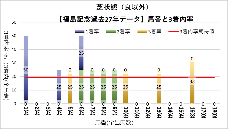 天候・馬場状態によらず、1番は常に好走する傾向が見られた。