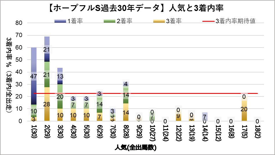 - 1人気(複勝率60.0%)、2人気(複勝率69.0%)、3人気(複勝率43.3%)