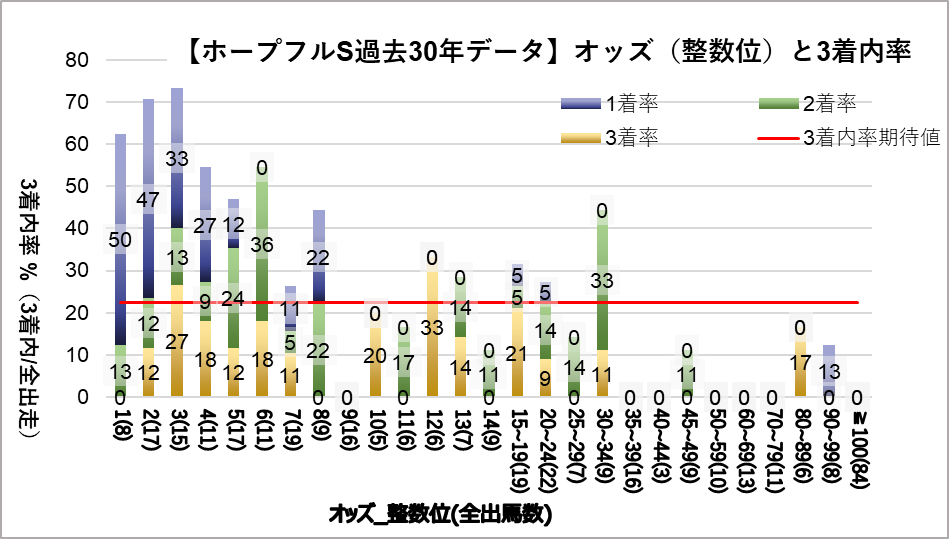 1.0~1.9倍(複勝率62.5%)、2.0~2.9倍(複勝率70.6%)、3.0~3.9倍(複勝率73.3%)、4.0~4.9倍(複勝率54.5%)、5.0~5.9倍(複勝率47.1%)、6.0~6.9倍(複勝率54.5%)、これらのオッズ帯に統計的有意差が認められ、平均複勝率(23%)よりも好走する傾向が見られた。