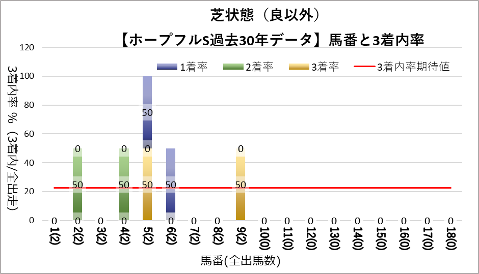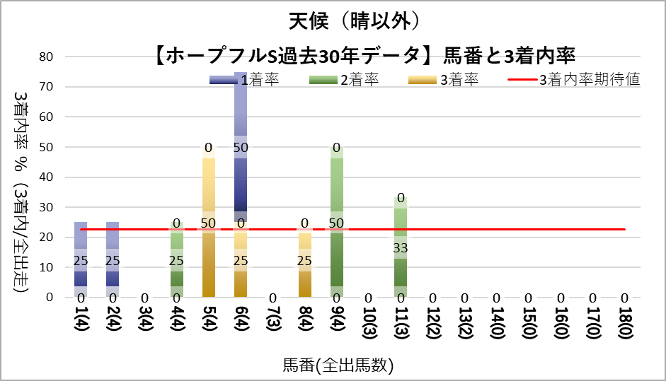 5番はどのような条件下でも好走している。その他特筆すべきは、晴以外の時の6番は複勝率75%と非常に好走している。