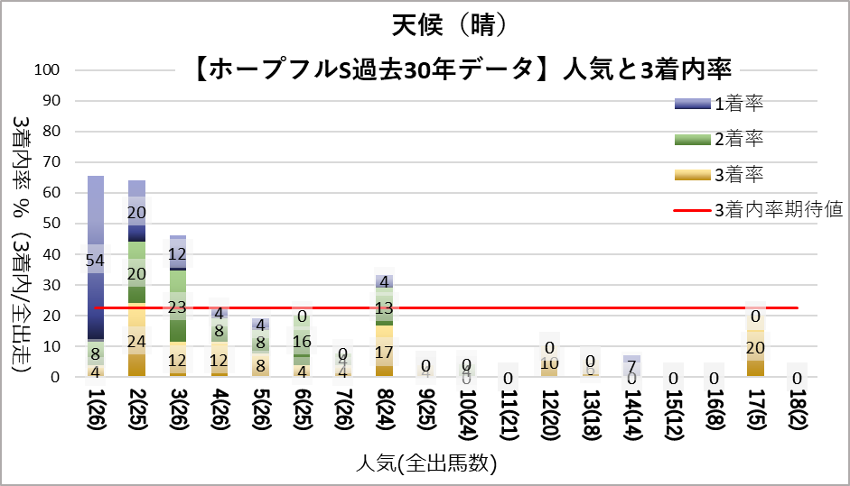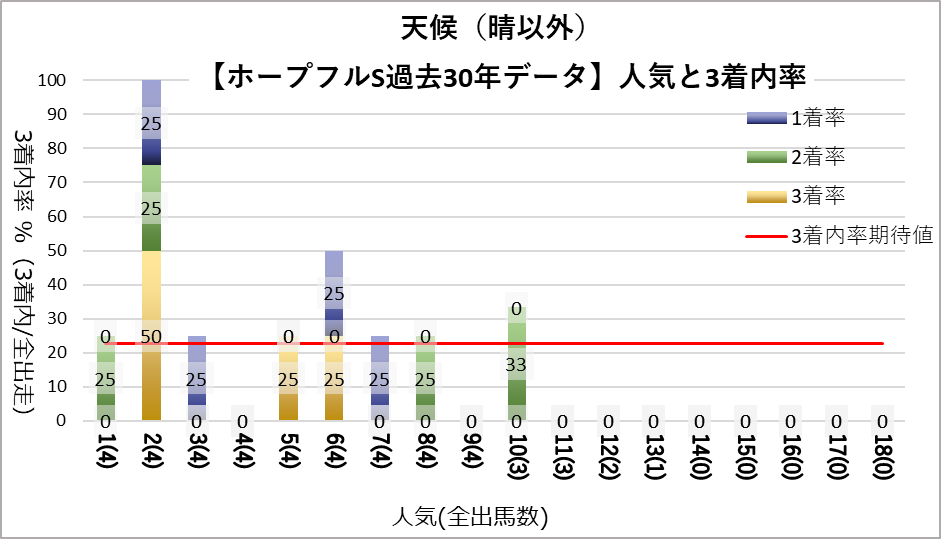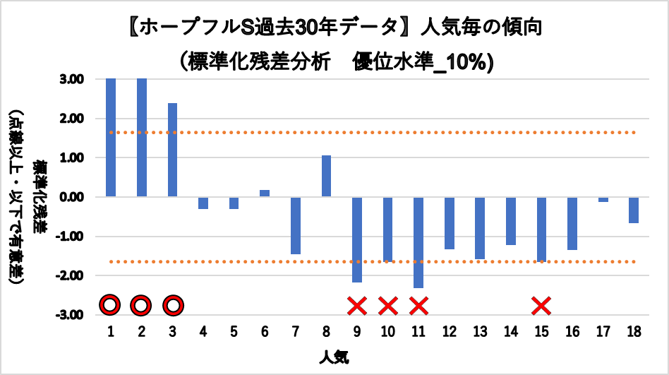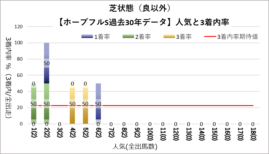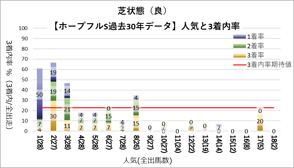 1人気(複勝率60.0%)、2人気(複勝率69.0%)、3人気(複勝率43.3%)、これらの人気に統計的有意差が認められ、平均複勝率(23%)よりも好走する傾向が見られた。