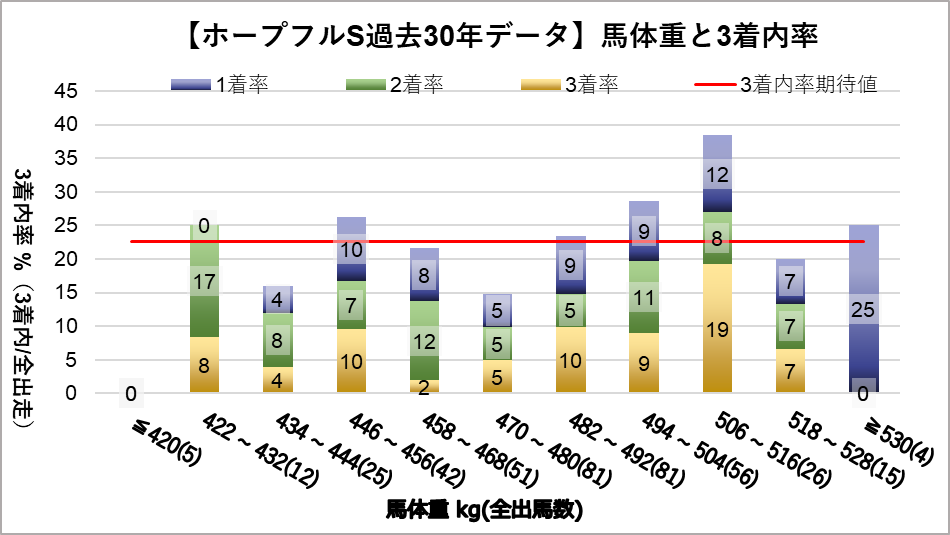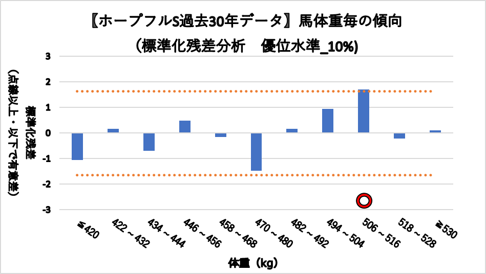 馬体重506~516kgレンジ(複勝率38.5%)において、統計的有意差が認められ、平均複勝率(23%)よりも好走する傾向が見られた