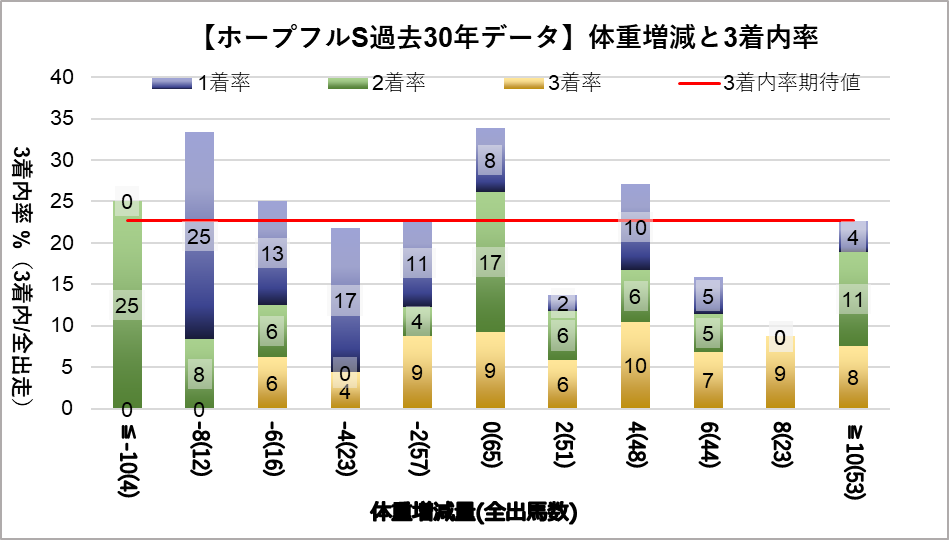 増減量±0kg(複勝率33.8%)に統計的有意差が認められ、平均複勝率(23%)よりも好走する傾向が見られた。