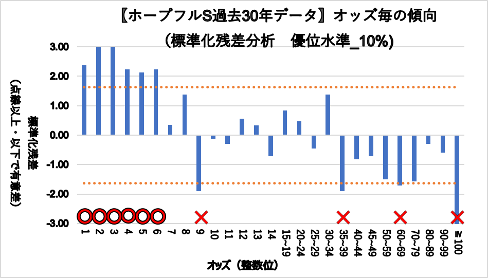 一方、9.0~9.9倍、35.0~35.9倍、60.0~69.9倍、100倍以上は統計的に見ても有意に凡走傾向である。