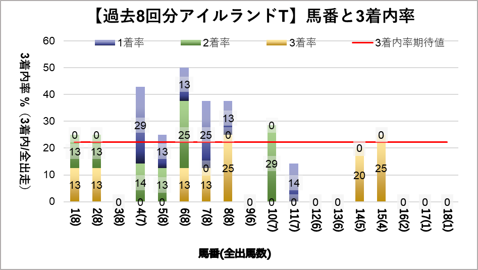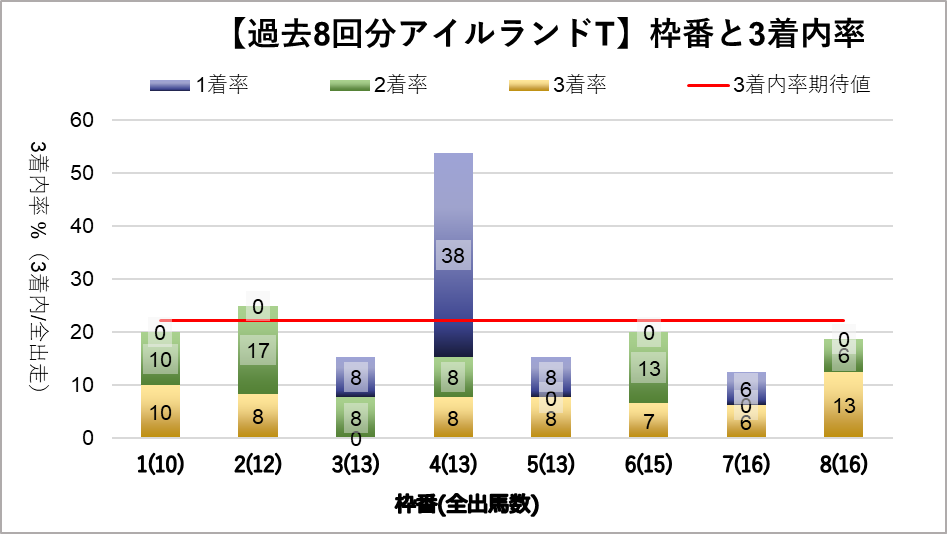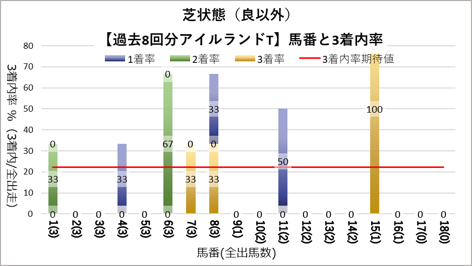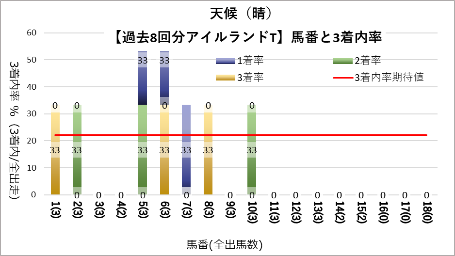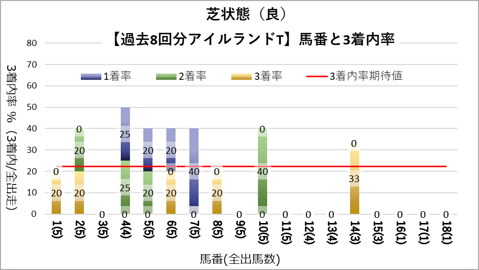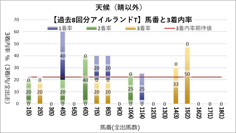 晴だと5番が好走。晴以外だと4番の成績が非常に良い。6番は天候に関わらずそこそこ走っているため、全体的傾向として3着に入りやすい結果となった。