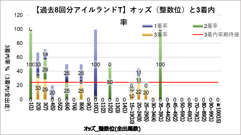 また100倍以上は3着内に入りにくい傾向が見られた。