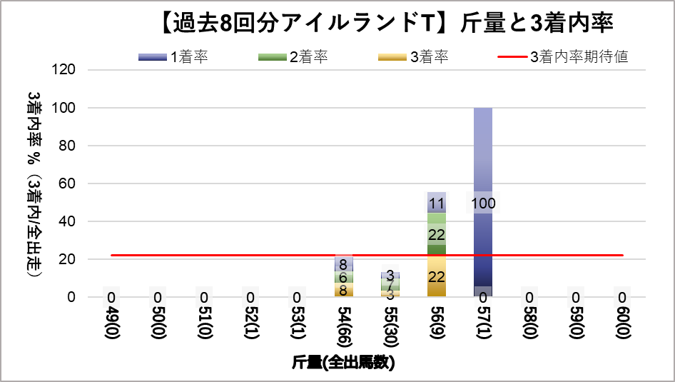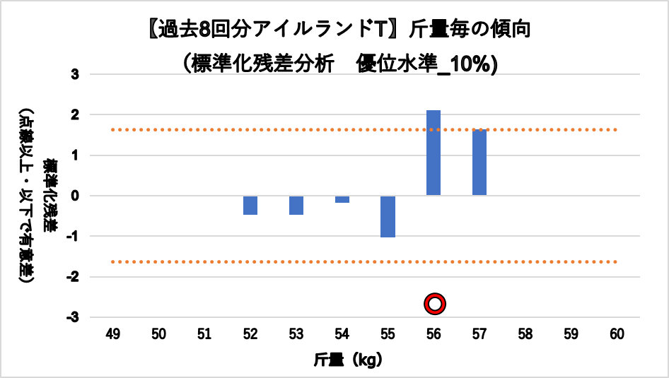 斤量56kgにおいて3着内に入りやすい傾向が見られた。