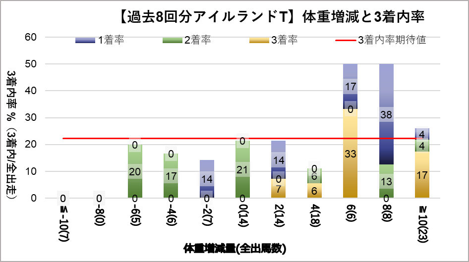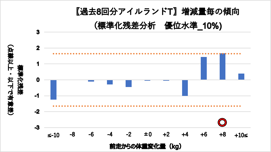 前走から+8kgの馬が3着内に入りやすい傾向が見られた。