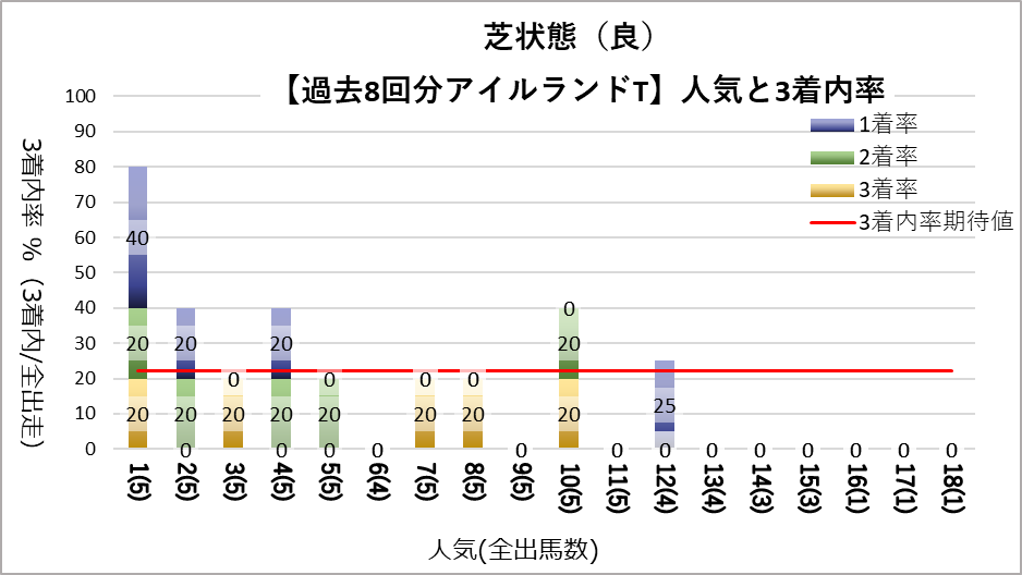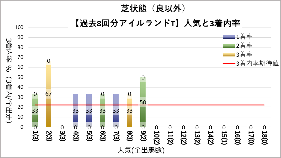 一方芝状態が良以外の時、1,2,3番人気が勝ったことはなく、全体的に荒れる傾向である。