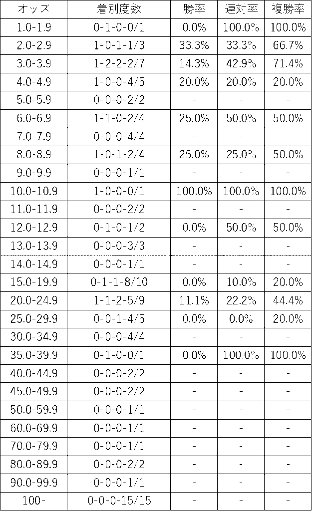 しかしながら1.0~2.9の成績が悪いわけでは決してなく、使用したデータ数が少ないため統計的な有意差が見られなかっただけだと思われる。事実1.0~1.9倍、2.0~2.9倍の複勝率はそれぞれ、100%と66.7%と非常に高い水準である。