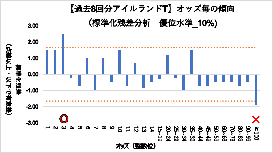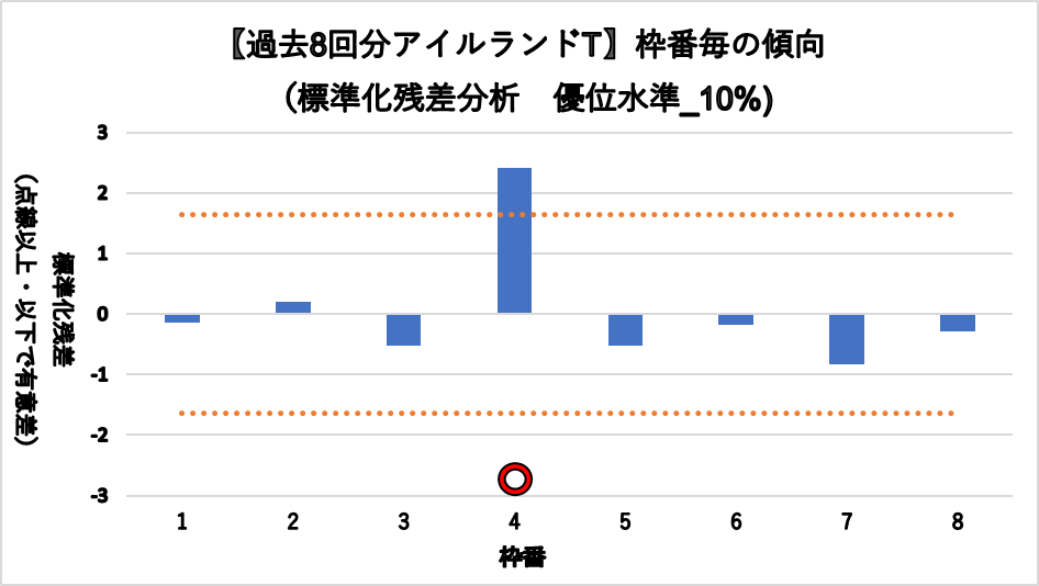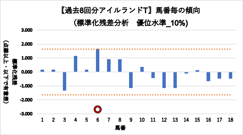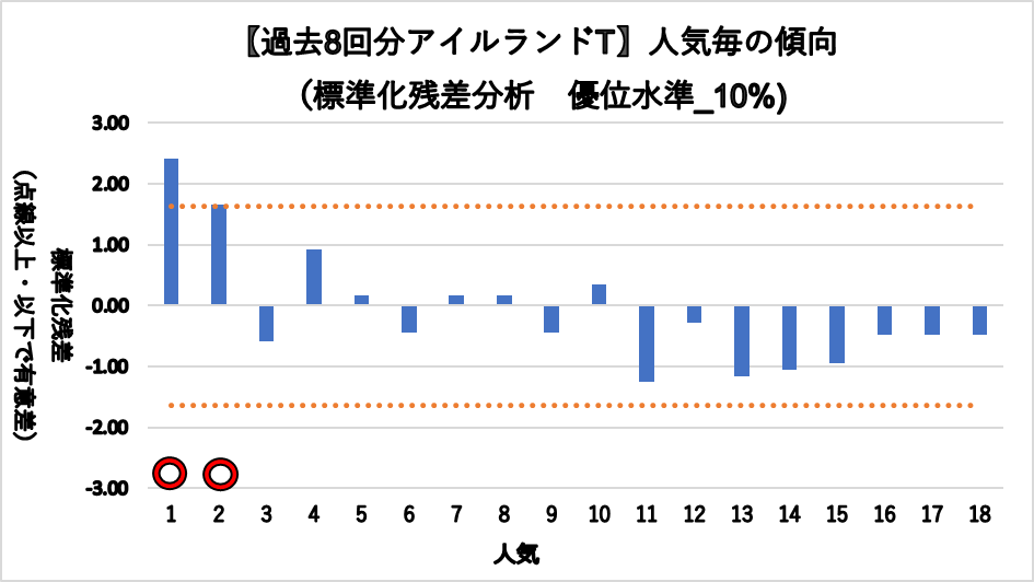 統計的に有意差があった項目について、3着内率グラフと統計処理(標準残差分析)グラフの2つを掲載しています。