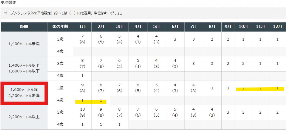 3歳以上牝馬であるため、基本的な斤量は55kgである。追加重量が1kgもしくは2kgということで、3歳10月以上が良いの馬が良いと思われる。