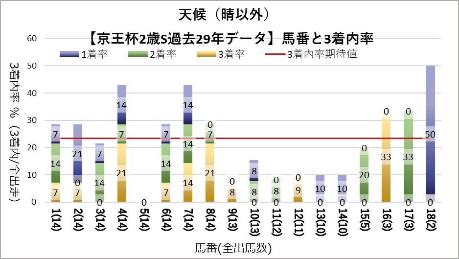 有料級!過去レース統計解析結果まとめ京王杯2歳ステークスの過去29レース分のデータを統計的に解析し、得られた傾向から有力馬と消し馬を選定しました。評価項目は下記の9個+α。*印の項目は追加で天候(晴と晴以外)と馬場状態(良と良以外)で条件分...