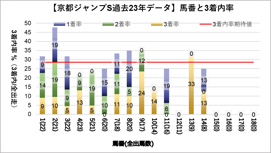 過去レースは最大でも14頭立てであり、2枠=2番となっています。15頭以上の出走がある場合は、2枠に3番が入ってきますので、ご注意ください。