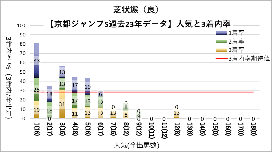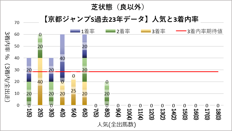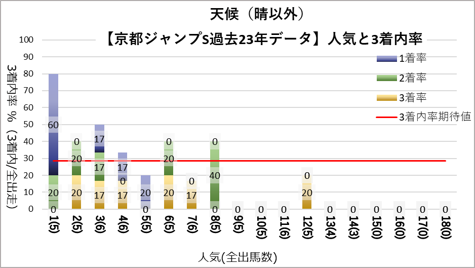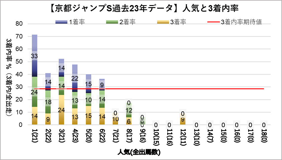 - 1人気(複勝率71.4%)、3人気(複勝率52.4%)、4人気(複勝率47.8%)が好走