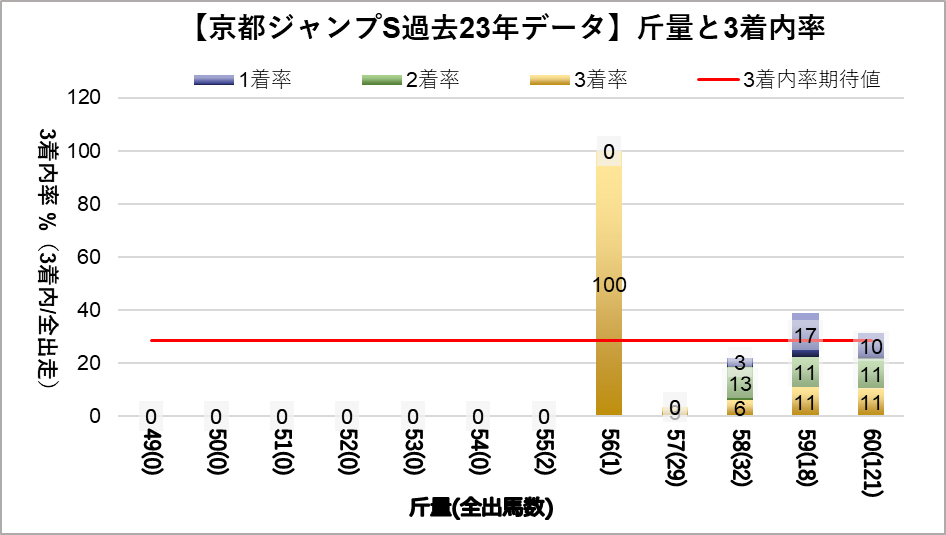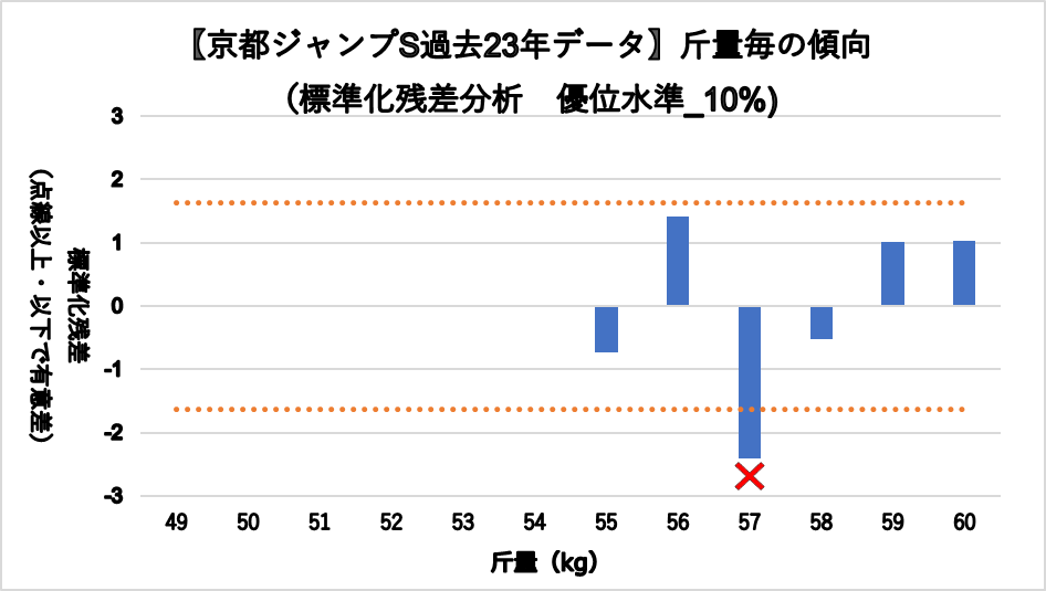 - 斤量57kg(複勝率3.4%)について馬券に絡みづらい