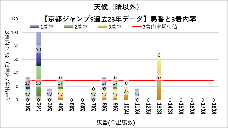 今回好走傾向が見られた2番の成績を確認すると、晴以外の時の成績がかなり良く、複勝率100%を記録している。