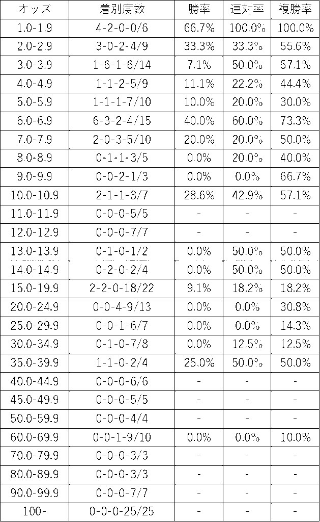 1.0~1.9倍(複勝率100%)、3.0~3.9倍(複勝率57.1%)、6.0~6.9倍(複勝率73.3%)が、有意に好走する傾向が見られた。