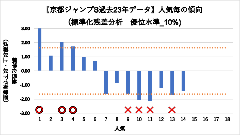 統計処理グラフでは3着内に入りやすい条件と入りにくい条件がわかります。判別しやすいよう、3着内に入りやすい条件に◎入りにくい条件に×を記載しますので、軸馬の選定や消し馬の判別にご利用ください。