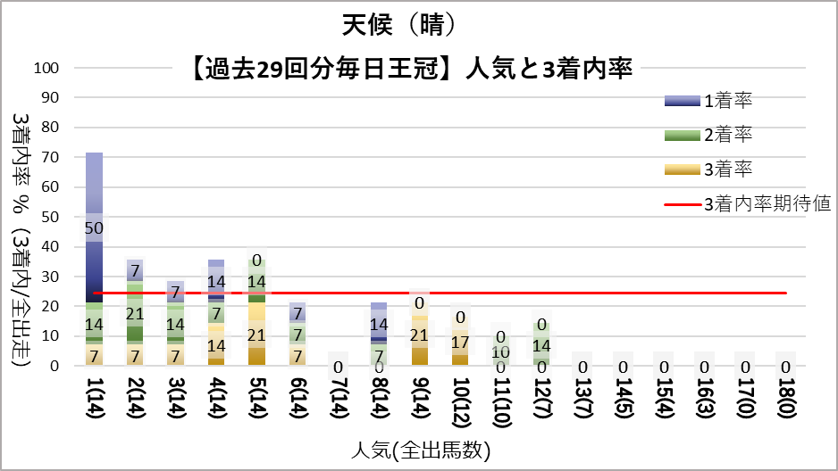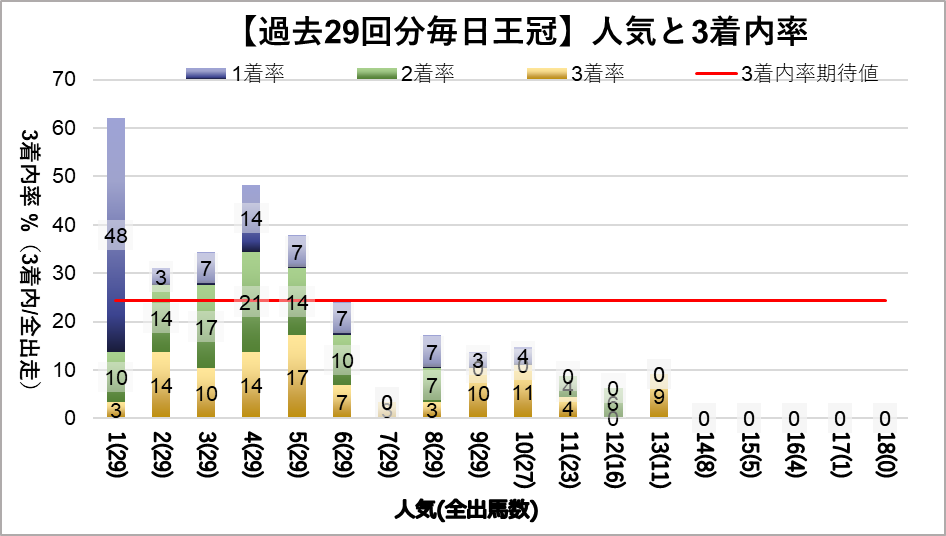 圧倒的な1番人気とまさかの4番人気が有意に3着内に入りやすい傾向。
