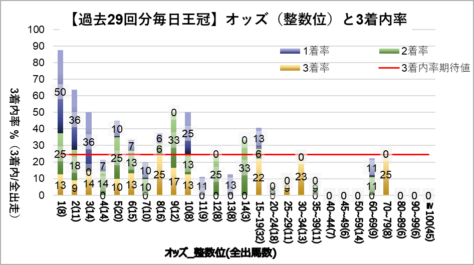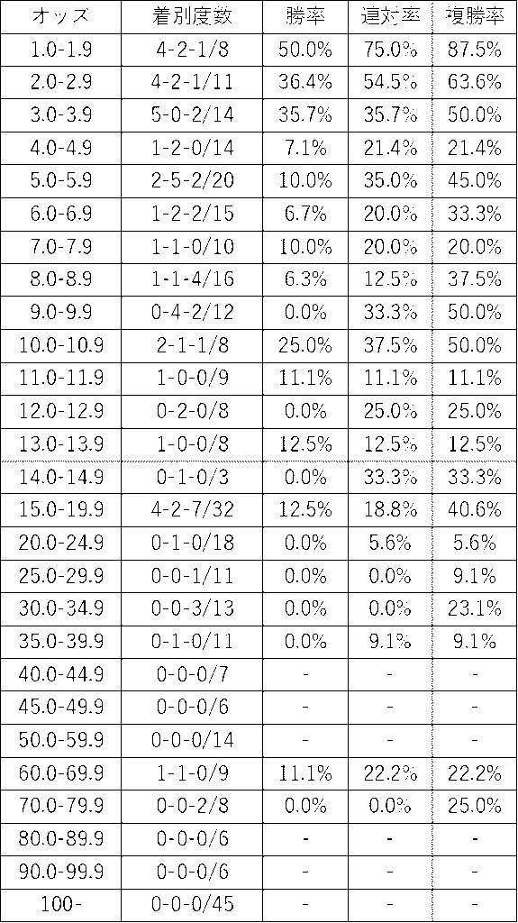 1.0~3.9, 5.0~5.9, 9.0~9.9, 15.0~19.9倍3着内に入りやすい傾向。