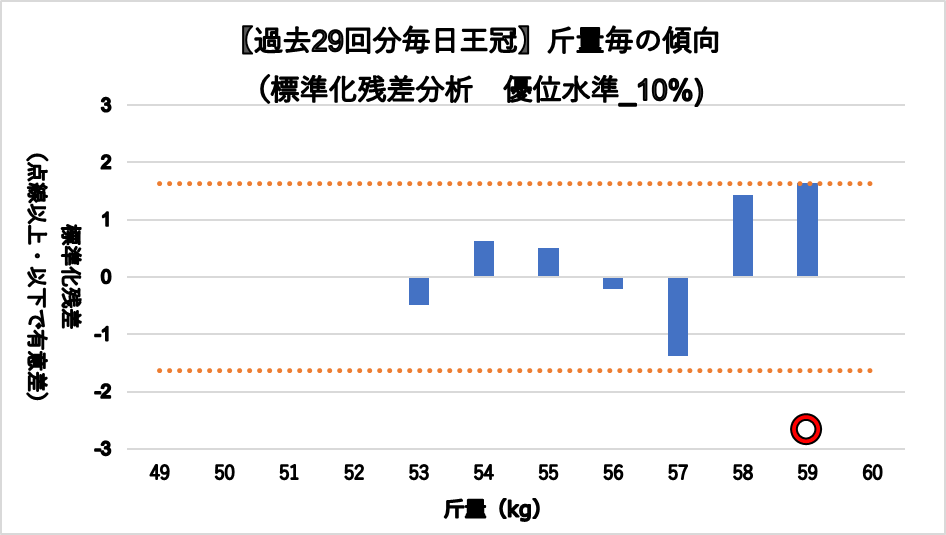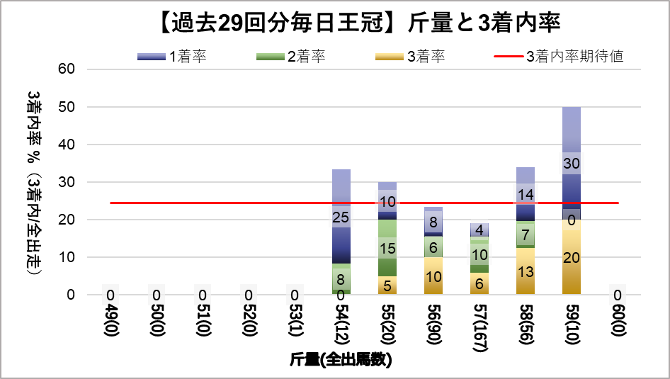 重たい斤量59kgでも有意に3着内に入りやすい傾向。