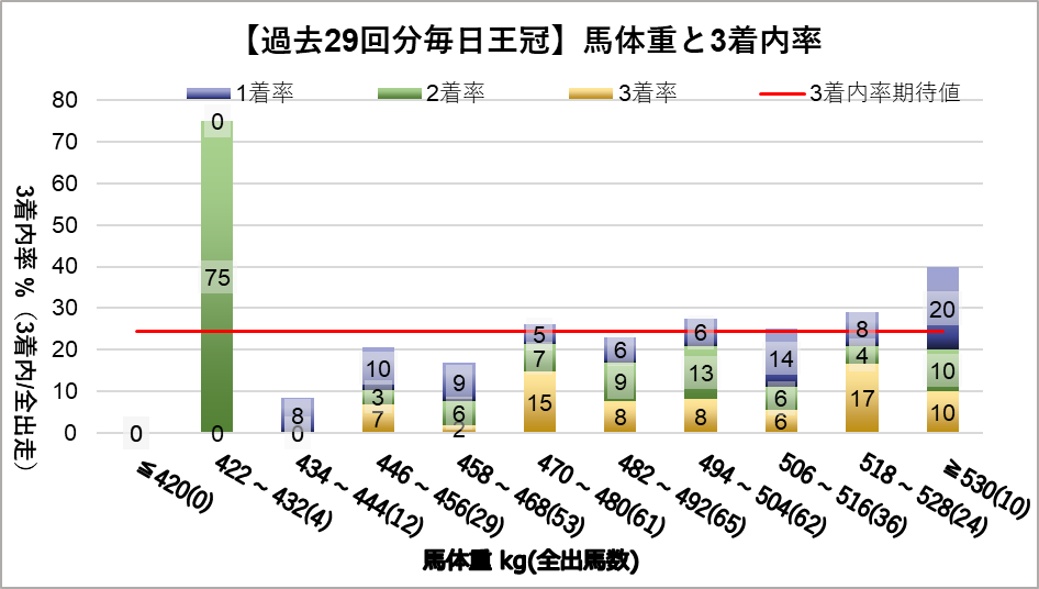 422~432kgは勝率0%でも連帯率75%の好成績。
