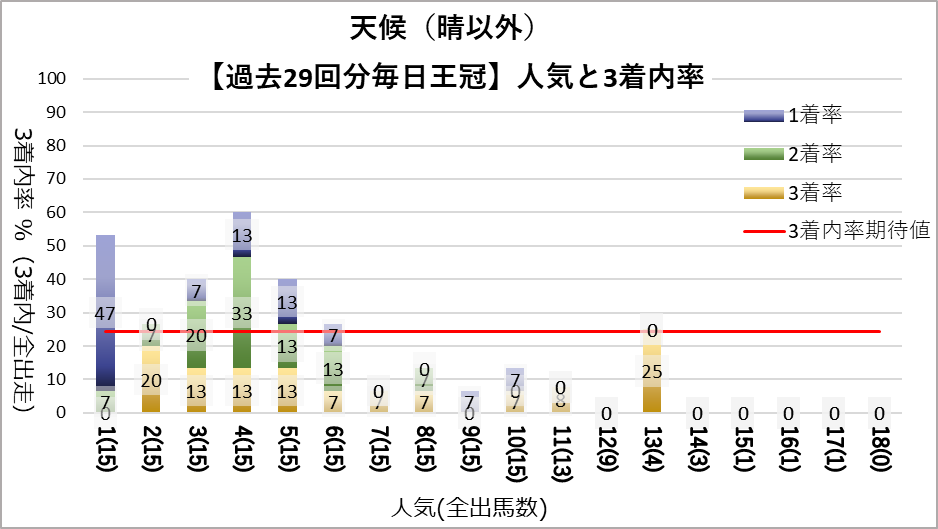 天候・馬場状態に関係なく1番人気は好走傾向。注目すべきは天候が晴以外の時の4番人気