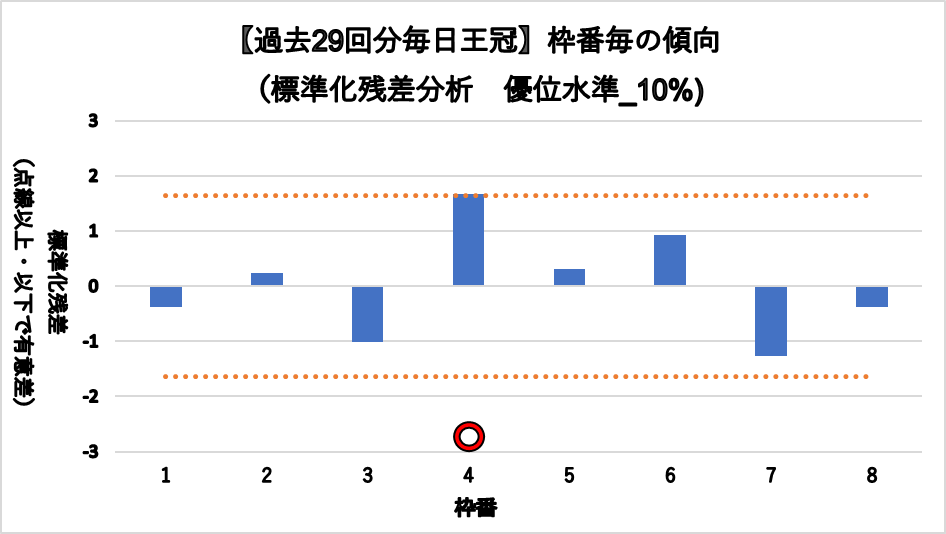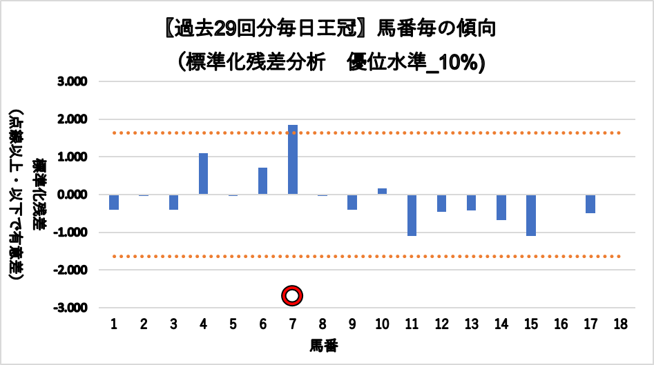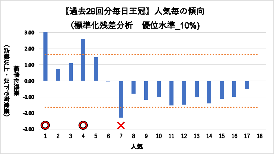 統計的に有意差があった項目について、3着内率グラフと統計処理(標準残差分析)グラフの2つを掲載しています。