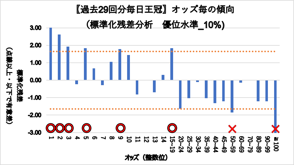 統計処理グラフでは3着内に入りやすい条件と入りにくい条件がわかります。判別しやすいよう、3着内に入りやすい条件に◎入りにくい条件に×を記載しますので、軸馬の選定や消し馬の判別にご利用ください。