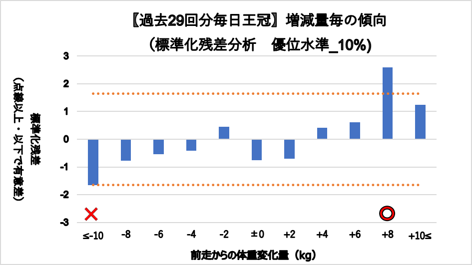 前走から8kg増量した馬は有意に3着内に入りやすい傾向。