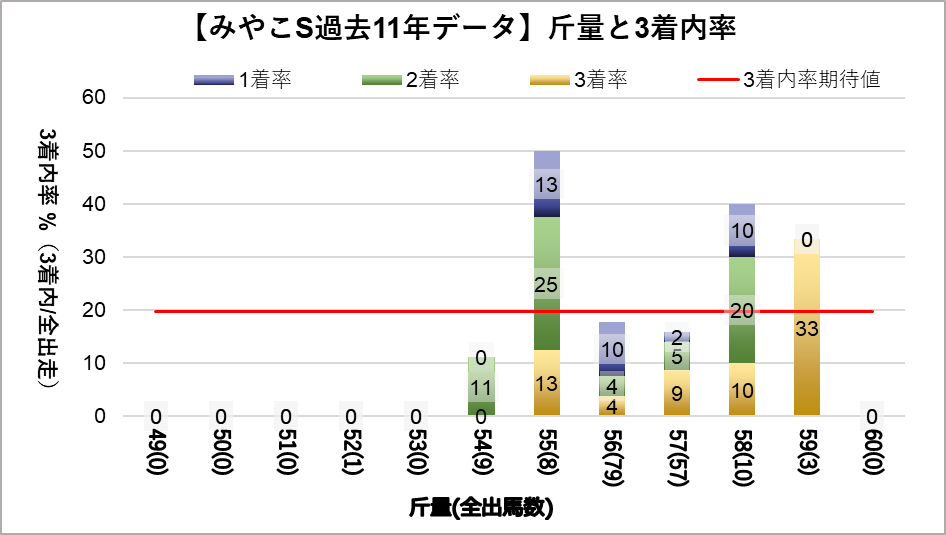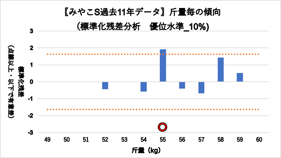 斤量55kg(複勝率50.0%)において有意に好走する傾向が見られた。