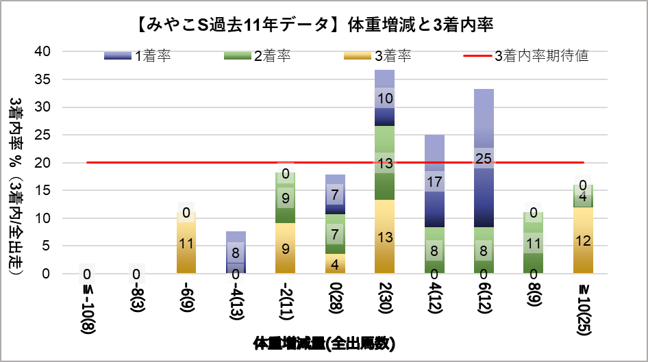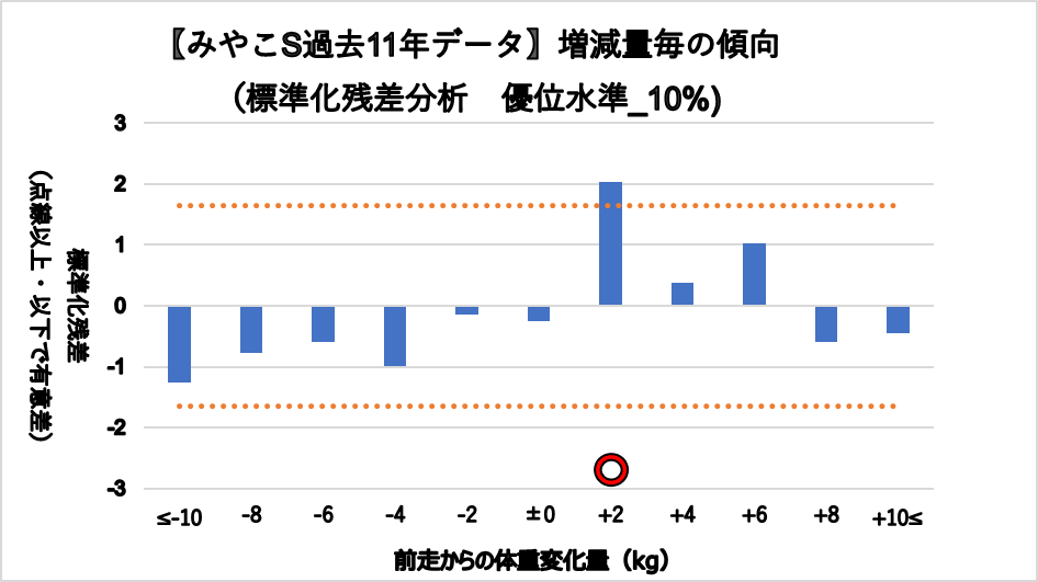 統計的検討は行っていないものの、勝率トップは+6kg(25.0%)、次点で+4kg(16.7%)となり、+2~6kgの成績が良いことがグラフからも見て取れる。