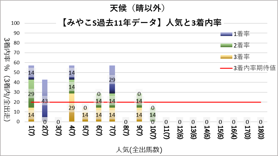 晴以外の天候では1,4,7人気の複勝率が同水準である。また勝率についても、1位の2人気(43%)に7人気(29%)が続く結果となった。