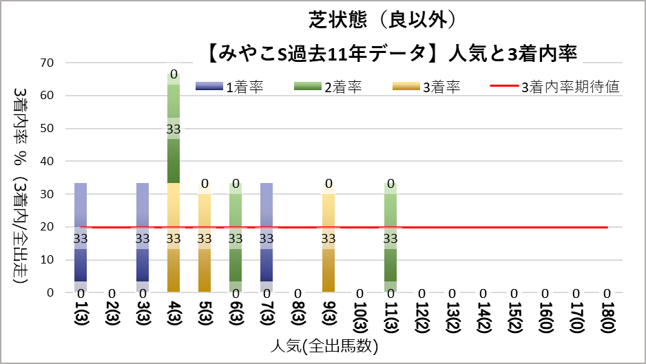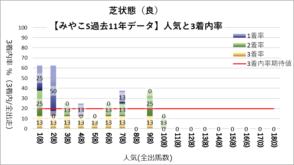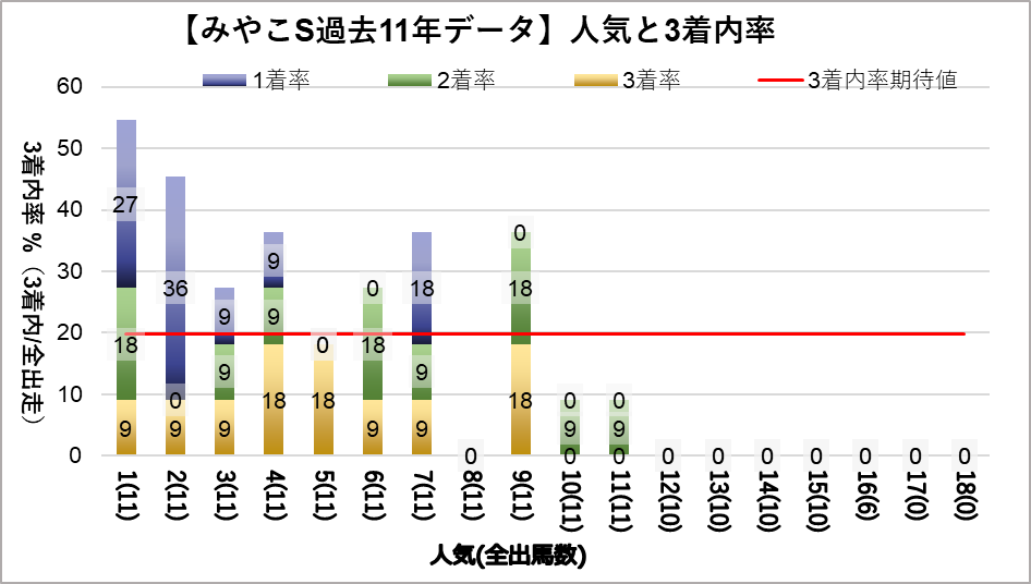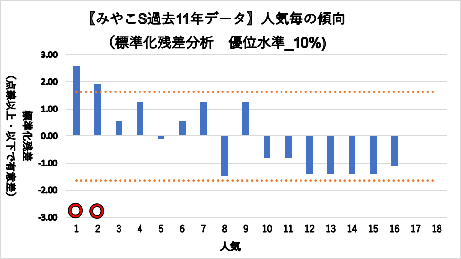 1人気(複勝率54.5%)、2人気(複勝率45.5%)に有意に好走傾向が見られた。
