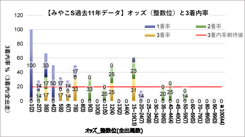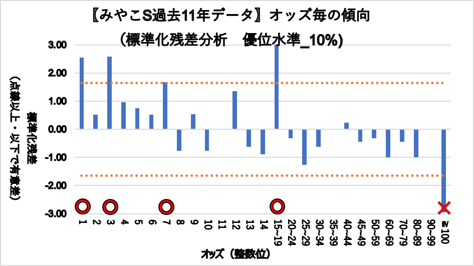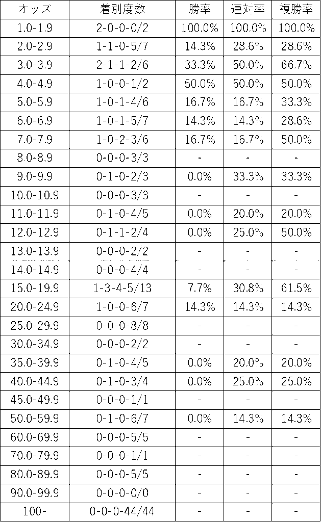 1.0~1.9倍(複勝率100%)、3.0~3.9倍(複勝率66.7%)、7.0~7.9倍(複勝率50.0%)、15.0~19.9倍(複勝率61.5%)が有意に好走する傾向が見られた。