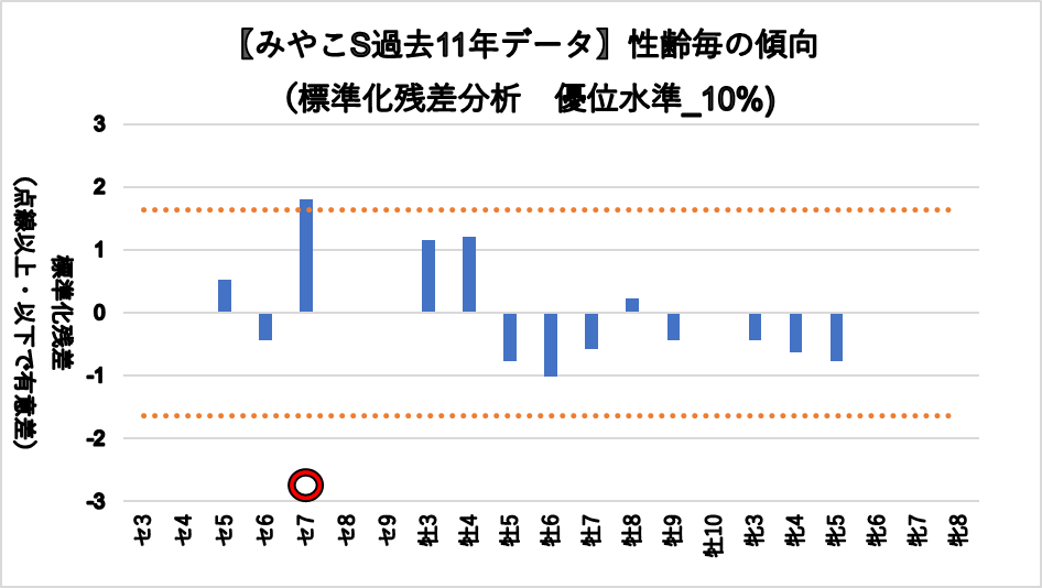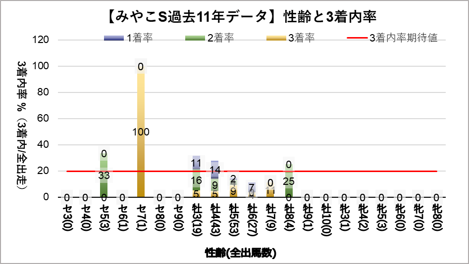 セン馬7歳(複勝率100%)において、有意に好走する傾向が見られた。