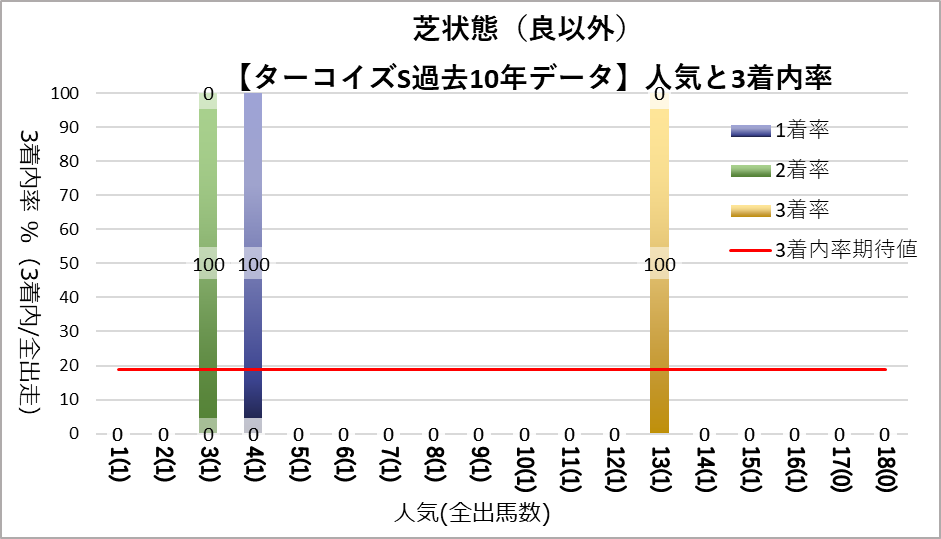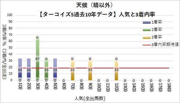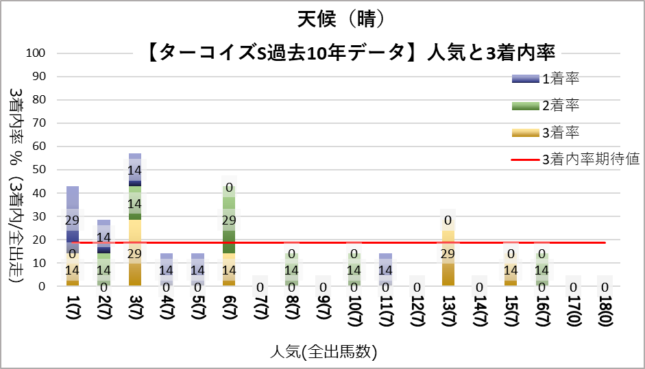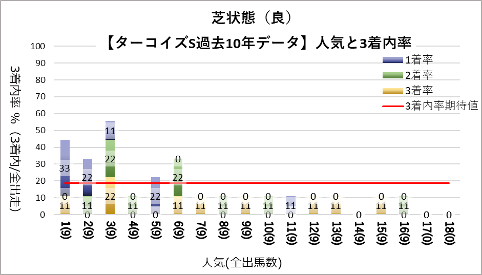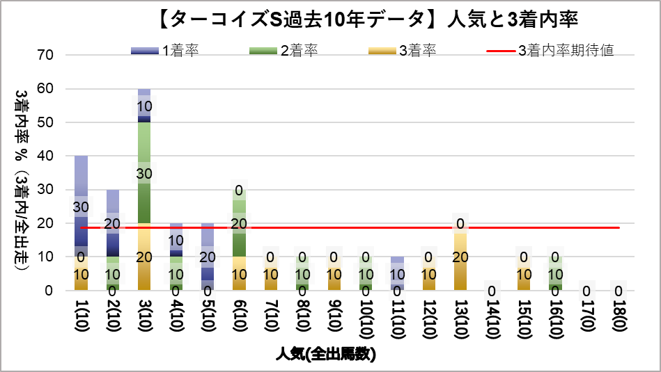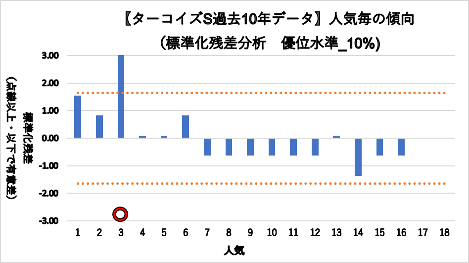 3人気(複勝率60.0%)に統計的有意差が認められ、平均複勝率(19%)よりも好走する傾向が見られた。