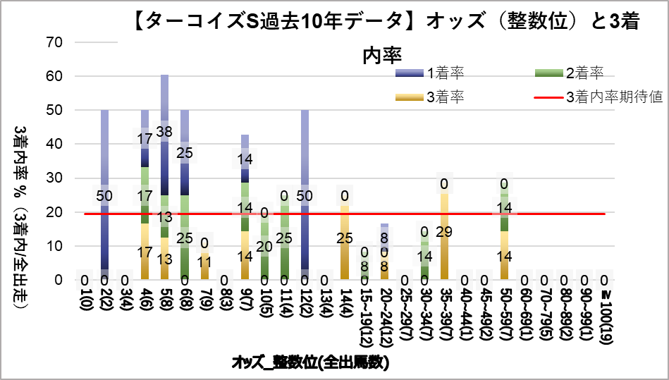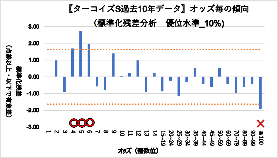 4.0~4.9倍(複勝率50.0%)、5.0~5.9倍(複勝率62.5%)、6.0~6.9倍(複勝率50.0%)、これらのオッズ帯に統計的有意差が認められ、平均複勝率(19%)よりも好走する傾向が見られた。