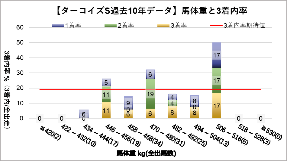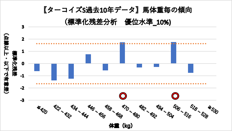 馬体重470~480kgレンジ(複勝率32.3%)と馬体重506~516kgレンジ(複勝率50.0%)において、統計的有意差が認められ、平均複勝率(19%)よりも好走する傾向が見られた